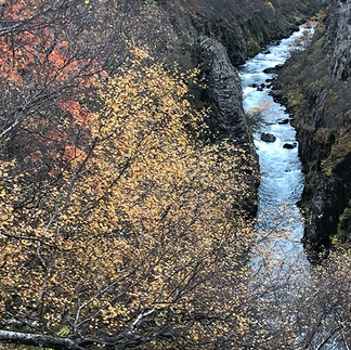 Our second silent walk was the last day of the trip in a patch of forest that could most certainly be labeled magical — towering evergreens with fluffy ground cover plants at their feet, rivers cutting through canyons with leaves in red, yellow, orange, rusty brown, drifting down confetti-like. There is a great tradition in Iceland of elves and trolls (harking back to the Vikings perhaps?) — probably early man’s attempt to describe the nature spirits (or life force which permeates all things). On this silent walk, I wouldn’t have been surprised to see an elf or two peeking out from behind the trees. Along this path was a handmade wooden arrow pointing the walker in the correct direction. A sign worthy of the yellow brick road (“Surrender, Dorothy”) — only this surrender was to the earth, the playful nature spirits, trees arching their branches protectively above us, the crunch of dried leaves underfoot, seeing one’s place in life’s tapestry, cultivating equanimity, patience, gratitude for all that we have been given and for those dreams, hope and plans that are yet to come.